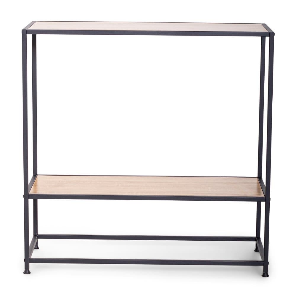 Konsolbord med sort ramme og to egetræslook hylder. Et elegant konsolbord med et enkelt og let udtryk. Minimalistisk design som kan placeres i ethvert hjem. Information: Bredde: 36 cm Længde: 80 cm Højde: 80 cm Nettovægt: 7.6 kg Belastning: 20 kg pr plade Leveres: Adskilt Materiale: Stål, spånplade, melaminfolie